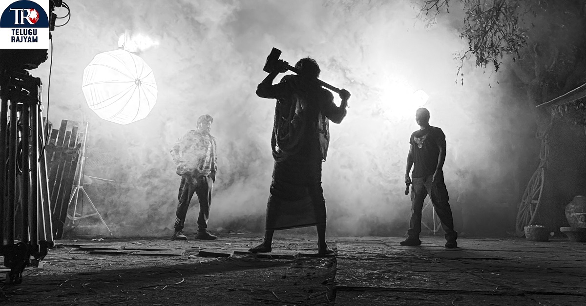 Shot in striking monochrome, the frame from the shoot captures Sharwa standing on a road, gripping a hammer over his shoulder- silhouette soaked in smoke, grit, and menace. In front of him, we can see director Sampath Nandi, and stunt director Dilip Subbarayan. This image highlights action and intense nature of the movie.