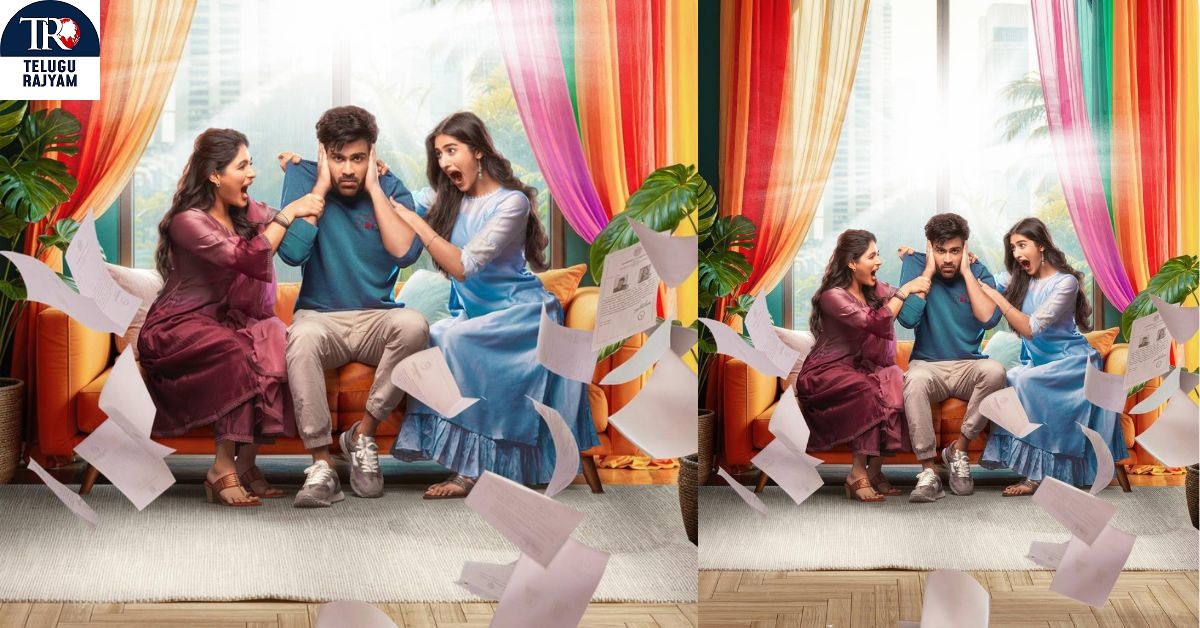 The poster depicts both women shouting in Sharwa’s ears, while he tries to block out the noise by covering his ears, emphasizing the comedic tension at play. Papers are seen flying around, adding to the chaos and humor. This scene sets the tone for a light-hearted, family entertainer, focused on Sharwa’s character navigating his amusing romantic misadventures.