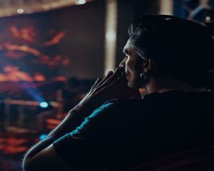 In the image, Ranveer seems to be inside a theatre, looking at a distance.
